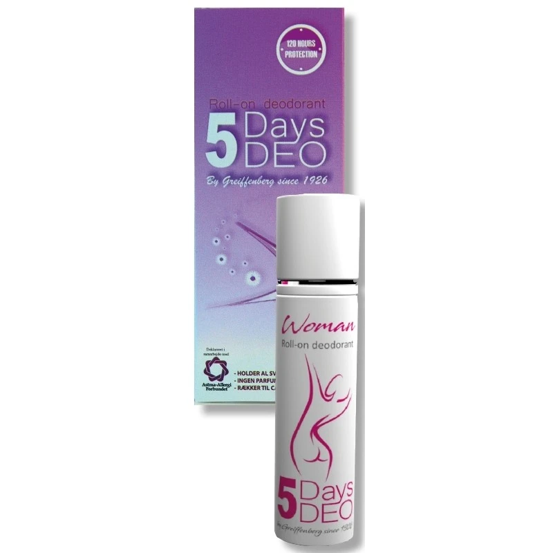 5 Days Deo Roll-On Deodorant – Women er en fantastisk antiperspirant i roll on form, der bekæmper svedlugt, og holder huden frisk i helt op til 5 dage. Den særlige formel er mild men super effektiv, hvilket gør at den passer til alle hudtyper. Derudover er den uden farlig kemi eller parfume, og er samtidig deklareret i samarbejde med Astma Allergi Danmark.