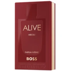 En lysende metallisk hætte tilføjer et majestætisk gyldent touch og fuldender duftens glasflacon. Dybrød lakering manifesterer passionen hos BOSS Alive-kvinden og rigdommen i denne Parfum Intense.