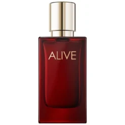 En lysende metallisk hætte tilføjer et majestætisk gyldent touch og fuldender duftens glasflacon. Dybrød lakering manifesterer passionen hos BOSS Alive-kvinden og rigdommen i denne Parfum Intense.