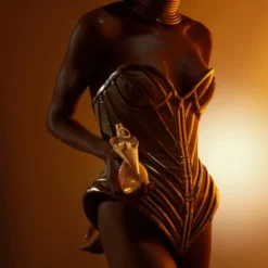De fremhævede kurver og den koniske buste, hylder en solar kvindelighed med en utæmmet ånd. Hendes omnipotente kraft er guddommelig og strålende.