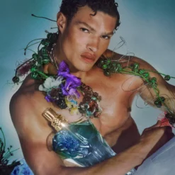 Flaskens ekstravagante design blomstrer stolt på skulderen af den blågrønne flaske. Denne fortryllende blomsterkonstruktion fanger vores fantasi. Den hypnotiske blå farve sammen med de æteriske, rebelske kronblade er næsten nok til at få dig til at glemme den nøgne fristelse i Le Beaus dristige og selvsikre overkrop.