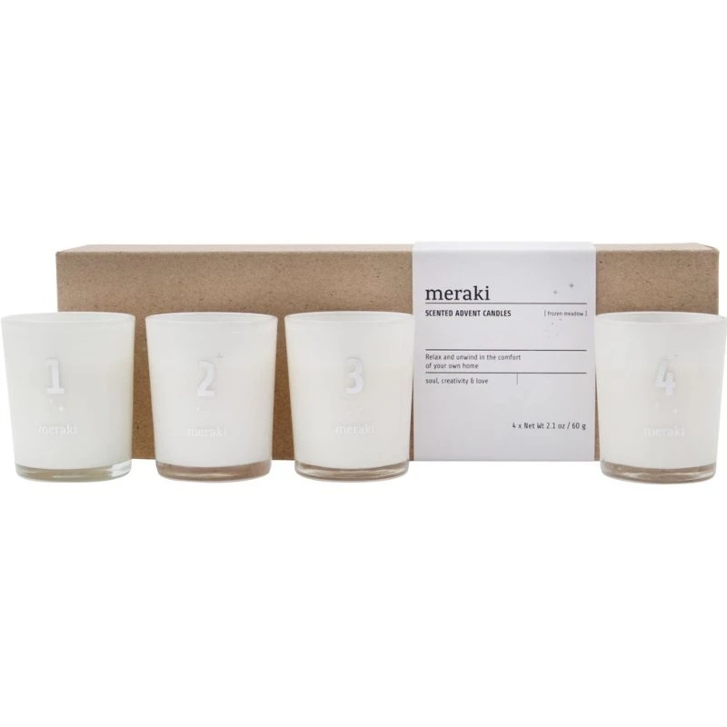 Meraki Scented Advent Candles – Frozen Meadow er en pakke med 4 super fine adventslys, som ikke kan andet end at skabe den perfekte julestemning med både duft og udseende.