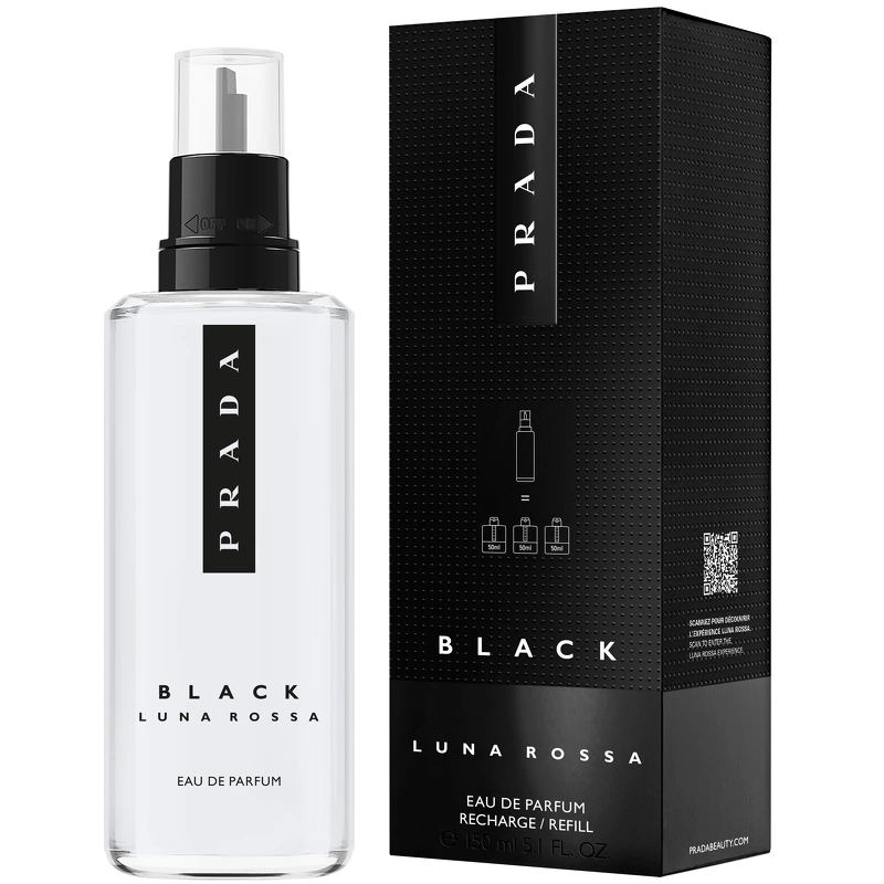 Luna Rossa Black Eau de Parfum 50 og 100 ml kan genopfyldes, så der bruges mindre emballagemateriale. En enkelt 50 ml flaske Luna Rossa og en 150 ml refill reducerer brugen af emballagemateriale med 55 % i alt sammenlignet med fire 50 ml flasker Prada Luna Rossa. Det omfatter 55 % glas, 70 % metaller, 45 % plast og 50 % pap.