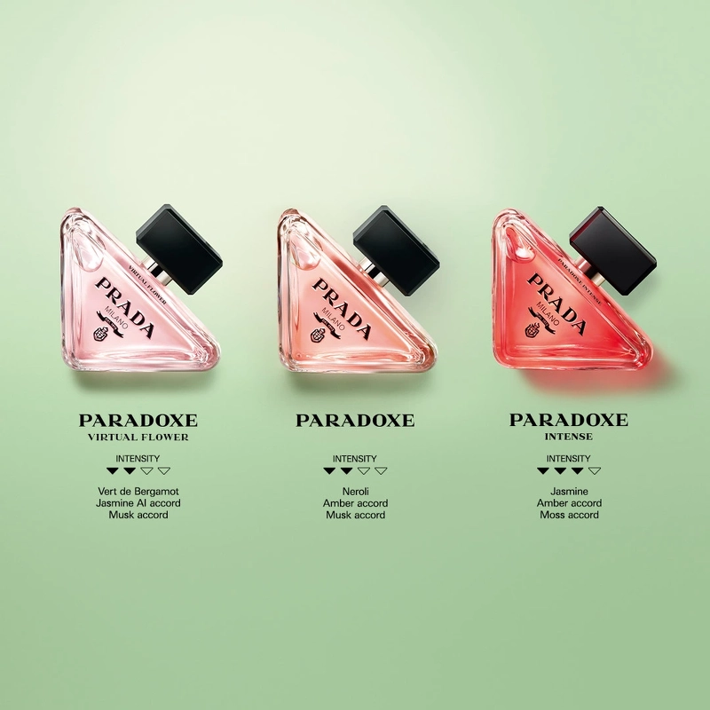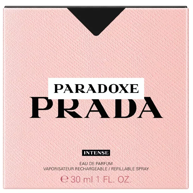 Flakonen er som et kunstværk, der kombinerer minimalisme med oprør. Inspireret af Pradas ikoniske trekantlogo hviler den minimalistiske flakon elegant på sin side. Den dybe lyserøde farve står i kontrast til Pradas våbenskjoldlogo og udstråler en unik rebelsk ånd. På den øverste skrå kant står ‘Paradoxe Intense’, hvilket afspejler duftens selvsikre karakter.