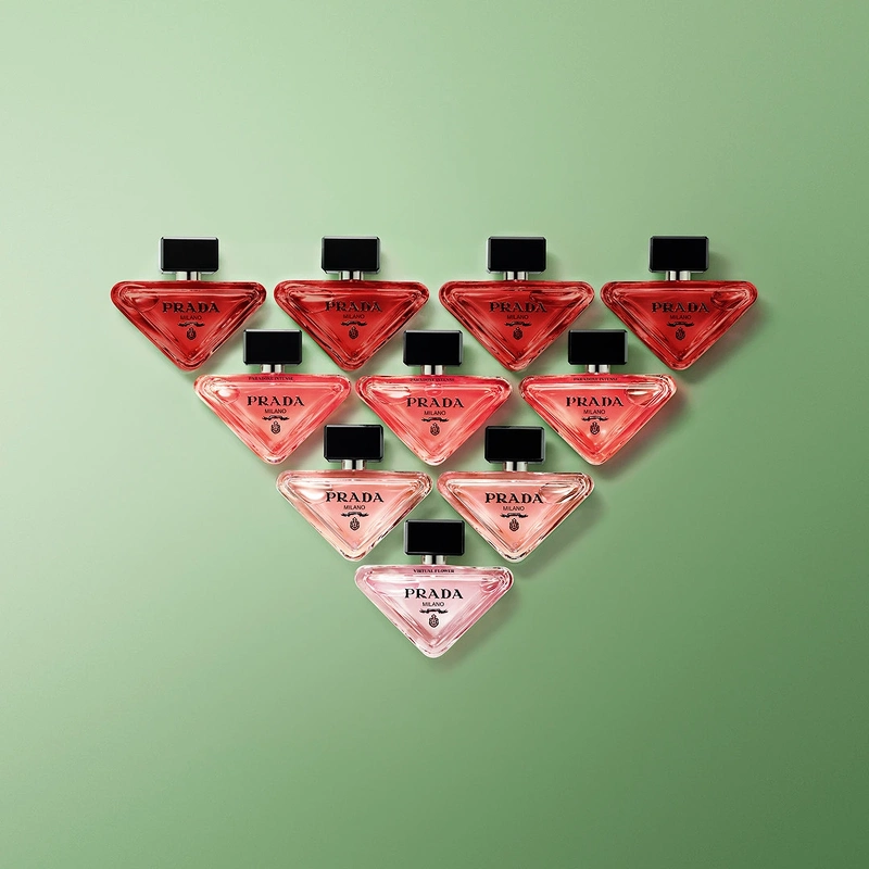 Ligesom den originale duft er den fornyede flakon et udtryk for husets essens af genopfindelse. Minimalistisk og delikat ved første øjekast, inspireret af det originale ikoniske Prada-trekantlogo, der er designet til at hvile på siden. Prada-våbenskjoldet står i kontrast til flakonens sofistikerede, dyb pink lakering. Paradoxe Radical Essence yderæske er præget for at afspejle brandets signatur Saffiano-læderkrydsklækning. Et samspil mellem duftens pink signatur og det sorte Prada-logo, der twister Paradoxe-etiketterne i sort for at afspejle den maksimale intensitet af denne radikale essens.