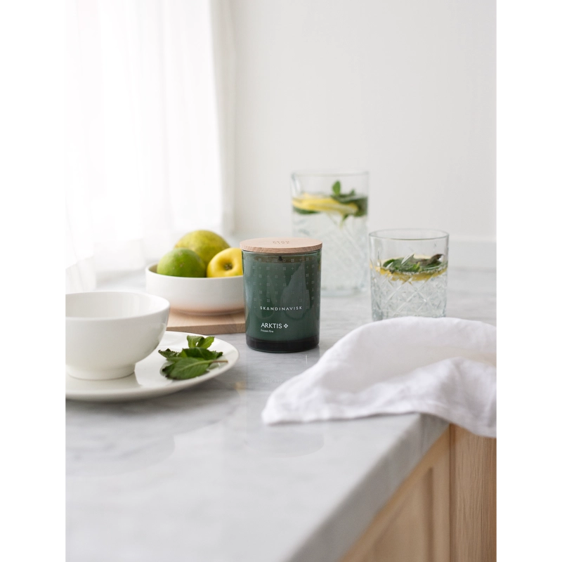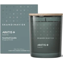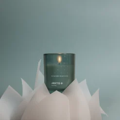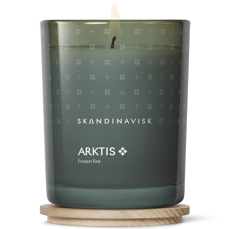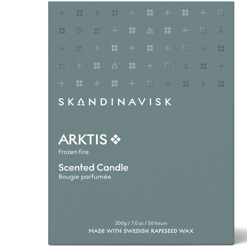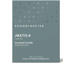 SKANDINAVISK ARKTIS Scented Candle er et stilfuldt duftlys med duftnoter af vindblæst træ, arktisk salvie, spearmint og snefnug.