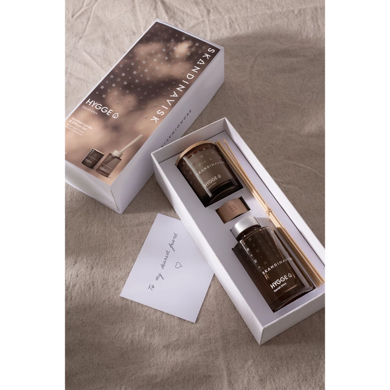 SKANDINAVISK HYGGE Scented Candle & Diffuser Set er en lækker gaveæske med 2 smukke og velduftende produkter i form af et duftlys og en diffuser.
