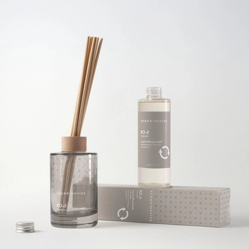 SKANDINAVISK RO Scent Diffuser er en diffuser, som har en duft af nyslået græs, faldne blade, agurk og vilde violer.
