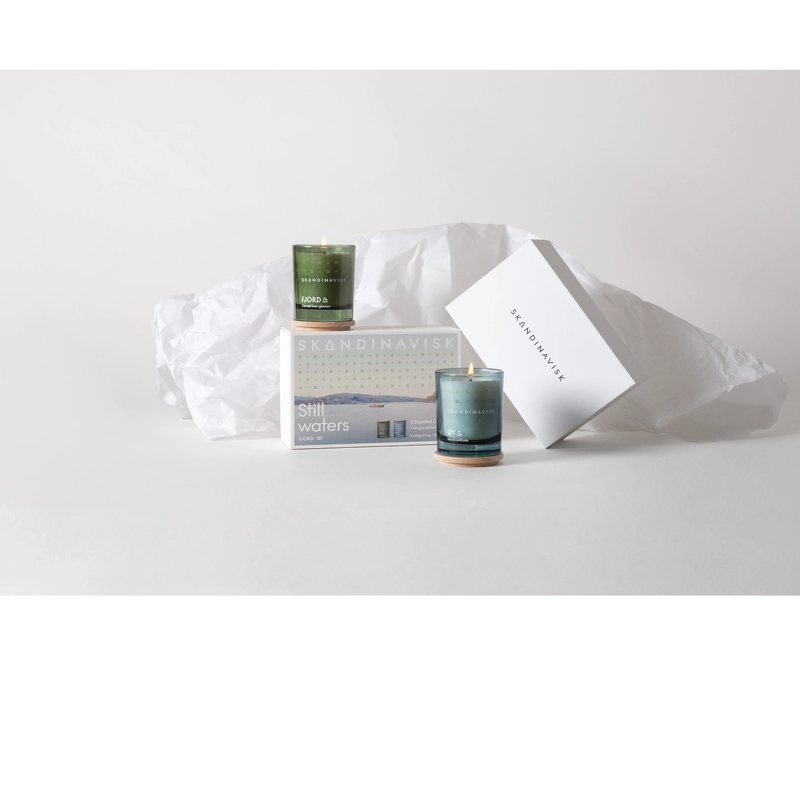 SKANDINAVISK Still Waters Scented Candle Giftset er et lækkert gavesæt med 2 små duftlys med noter inspireret af vidunderlige dufte, som man forbinder med endeløse dage brugt i en sommerdis langs kysterne.