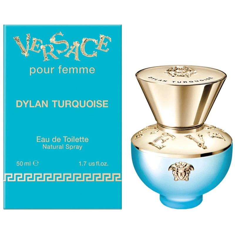 Versace Dylan Turquoise Pour Femme EDT er en ungdommelig, frisk og ret sensuel duft, der svøber sig om huden, og giver en ren og opløftende fornemmelse. Noterne af mandarin, citron, pink peber, fresia, jasmin, guava, cassis, træ og musk, leder tankerne direkte ud til en vidunderlig strand, med det pureste blå hav, og solens stråler der der varmer huden på en skøn måde. Disse krystalklare og rene noter finder du i en smuk turkis flakon med guld låg, der symboliserer de rigdomme og skatte der findes på havets bund.